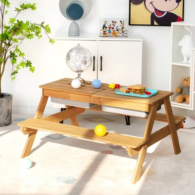 • 3-in-1 Multipurpose Kids Activity Table: With a removable tabletop and 2 plastic box es, this kids picnic table can be converted into a sand table with sandbox and a water table with water tank. Kids can enjoy ex citing water game, use their imagination to build sand castles in the yard or just sitting together to chat and eat on patio with their best friends.