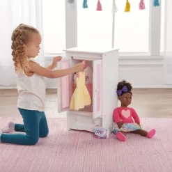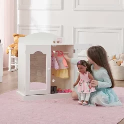Badger Basket Scrollwork Metal Doll Armoire With Storage Dresses And Accessories – White/Pink