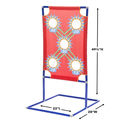 POP! Send soft foam balls flying through the air fast as lightning with our Target Blaster Game! The perfect late-night sleepover game or birthday party activity, this game appeals to all ages and encourages good sportsmanship while improving hand-eye coordination (sneaky, huh?) The lightweight 22″L x 28″W x 49.5″H target board is easy to assemble, and includes 5 scoring targets with mesh pockets to catch and contain the balls as they hit their target. 2 cool blasters shoot out 24 foam balls with a resounding popping noise. Go ahead and rack up those points, it’s a fun way to get some extra math practice! Take this portable two-player game with you wherever the fun beckons, it’s so easy to assemble and break down. Adult assembly required.