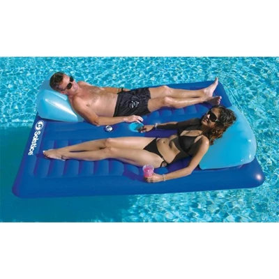 We all know that floats are an absolute must to bring your pool to the next level. The one problem with them? Sometimes it can be hard to hang out with friends and family on a standard float without floating away or getting uncomfortable. Grab a friend and hit the water with Solstice by Swimline Face2Face Pool Float, made for 2 people to relax and float together.Constructed with strong, vinyl material, this pool lounger is durable for years of water-centric fun. Great for both kids and adults, this inflatable water mat can accommodate up to 2 people and is suitable for ages 13 years and up. Designed with a comfy ribbed bottom and integrated dual headrests, the raft offers an incredibly comfortable lounging experience as you face your friend and float peacefully on the water. Quench your summer thirst using 2 built-in cup holders and the onboard center ice bucket for ultimate convenience. Easily inflate this mattress pad with the use of an air pump (not included) and deflate for a compact storage solution. Spend your summer in the sun on the Face2Face Inflatable Pool Mattress Float from Solstice by Swimline.